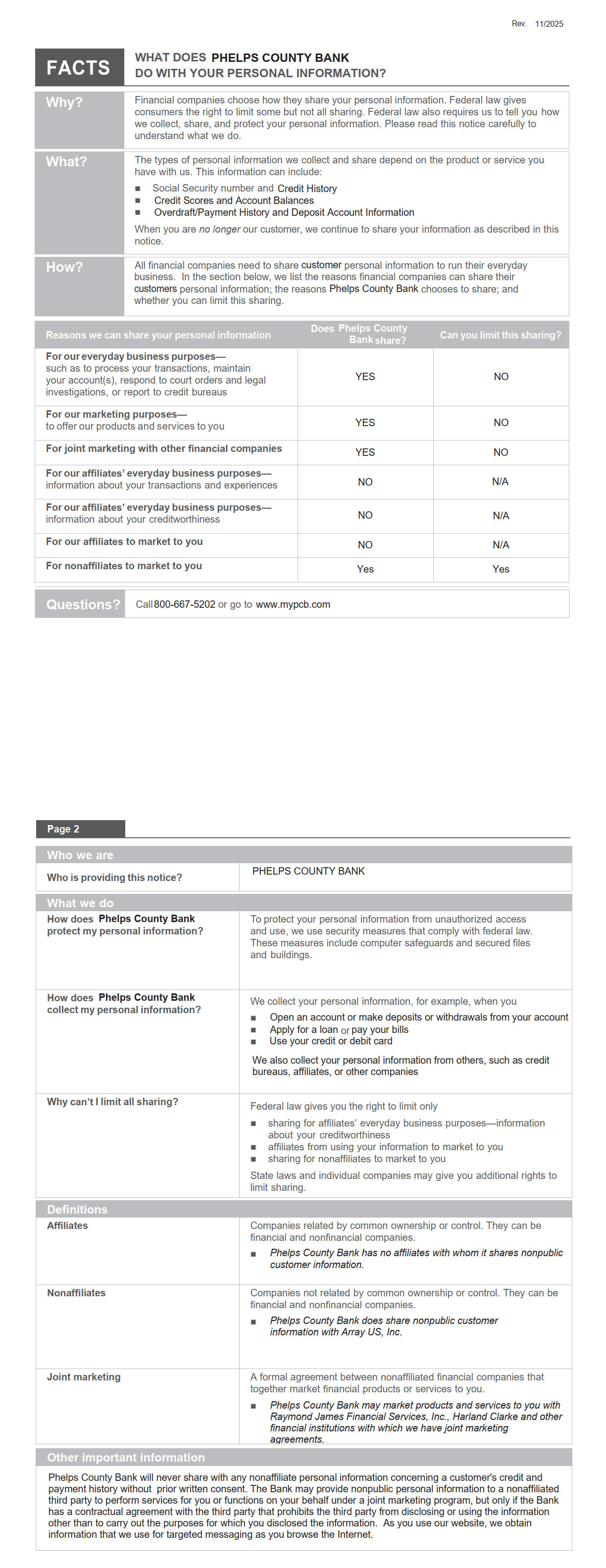 Phelps County Bank values our customers and their privacy. To protect your personal information from unauthorized access and use, we use security measures that comply with federal law. These measures include computer safeguards, secured files and more.